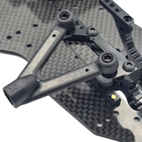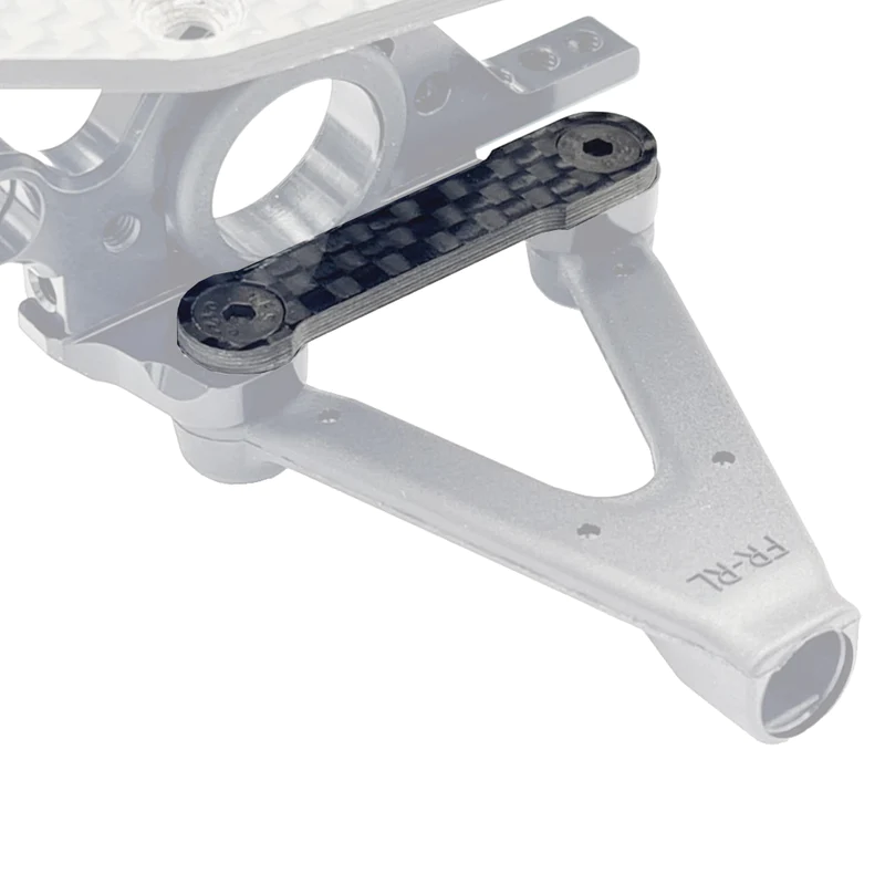 The 2mm thick carbon braces are directional, and screw in underneath the upper bulkhead. This is great because they clamp down directly under the upper bulkhead, meaning more contact to the bulkhead, keeping them as stiff as possible. The brace is then held in place with 3x8mm Countersunk Screws (not provided) which leaves it with a clean, minimal finish.