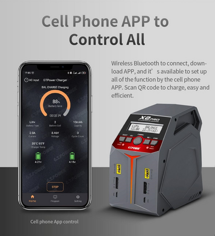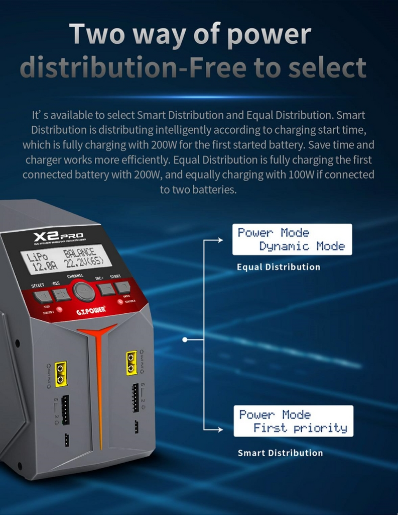 This G.T. Power X2 PRO V2 AC/DC Dual Channel Intelligent Balance Charger & Discharger. Multifunctional, all-in-one smart charger. Two individual outputs, with the possibility of simultaneous charging using Smart Distribution or Equal Distribution.